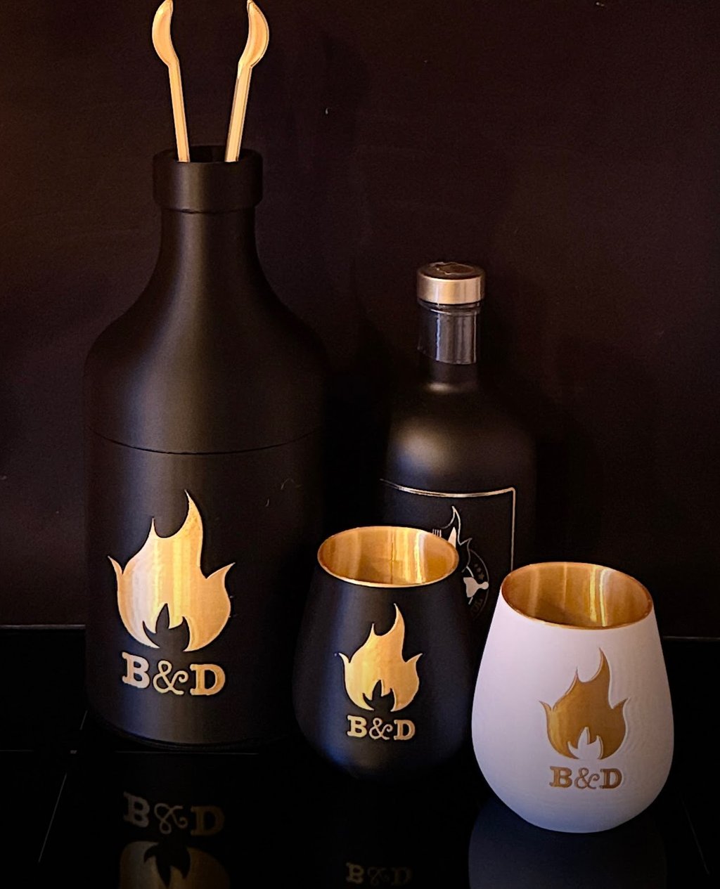 This gift bottle can be used to give away or present a drink bottle (for this customer his own GIN brand) and the bottom can serve as an ice bucket; of course, matching ice tongs and drinking cups are a must